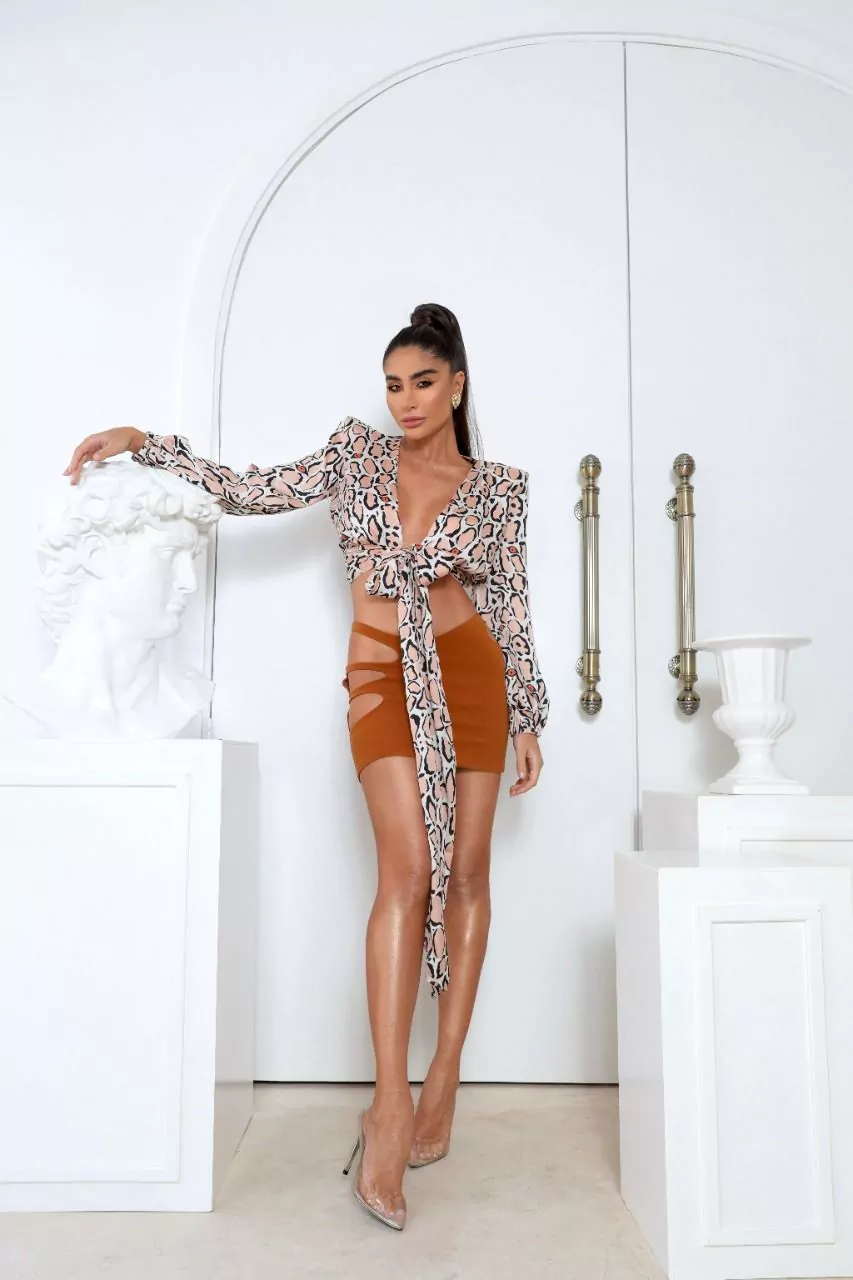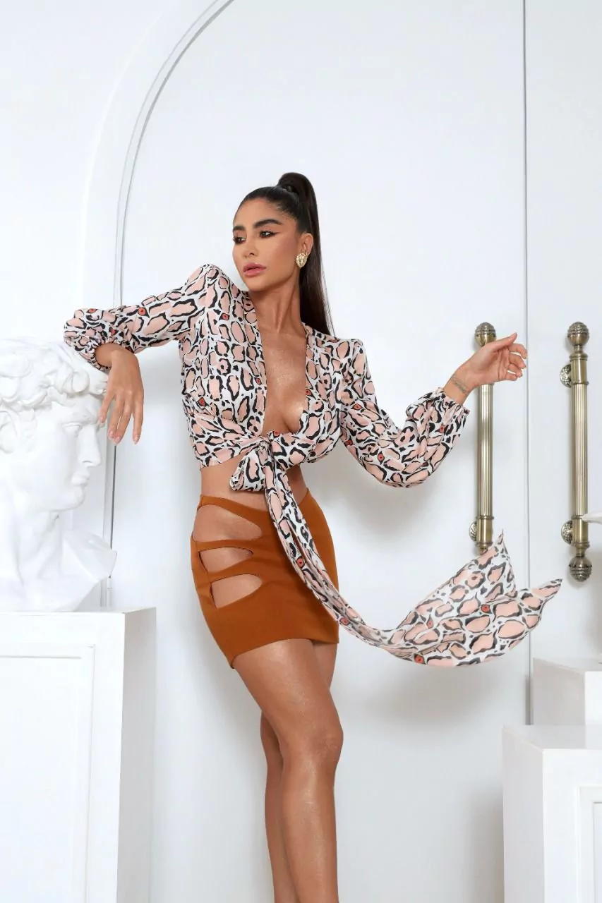 Blusa Elisa, confeccionada em cetim estampado, modelo manga longa, possui decote V e amarração versátil.
