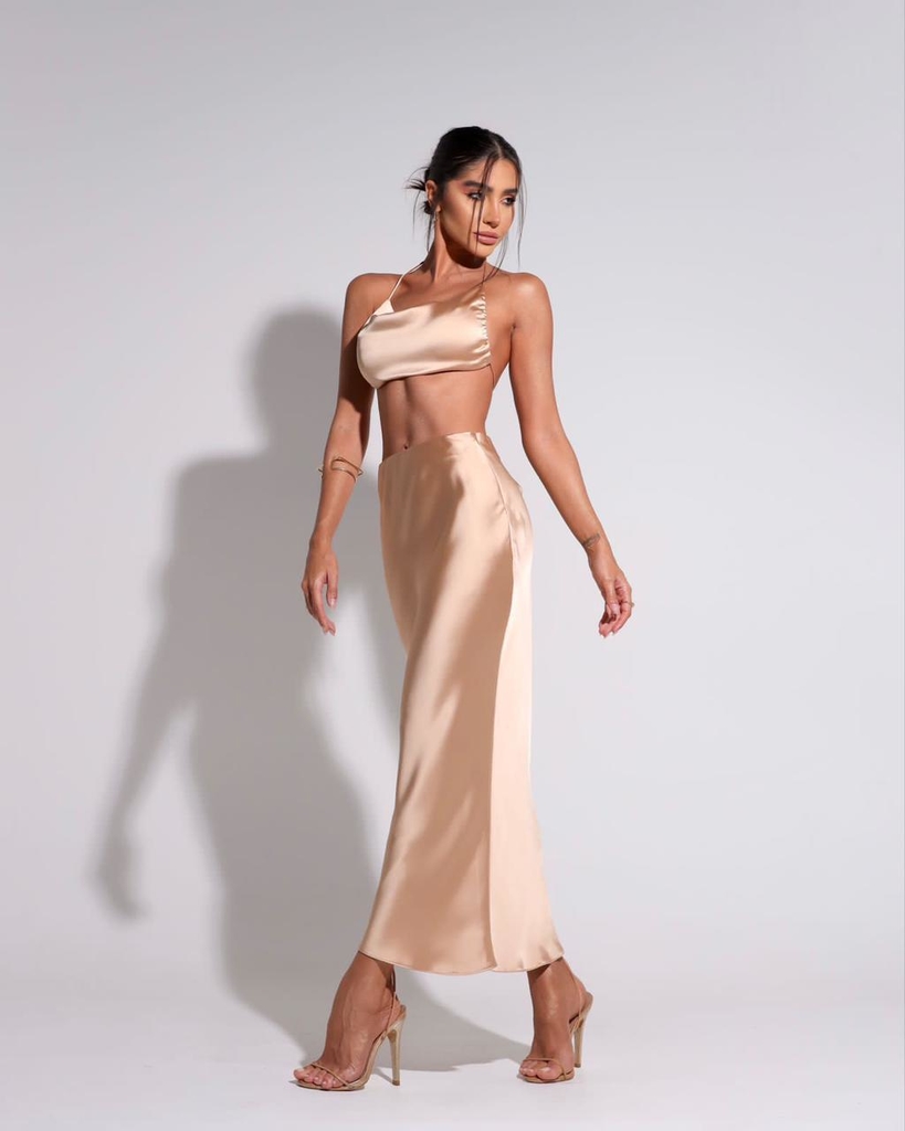 Conjunto de top e saia midi todo em crepe acetinado. Você pode amarrar o top de diferentes formas e a saia possui uma modelagem perfeita trazendo sofisticação à peça. Aquele look coringa, que você precisa ter em seu guarda-roupa.